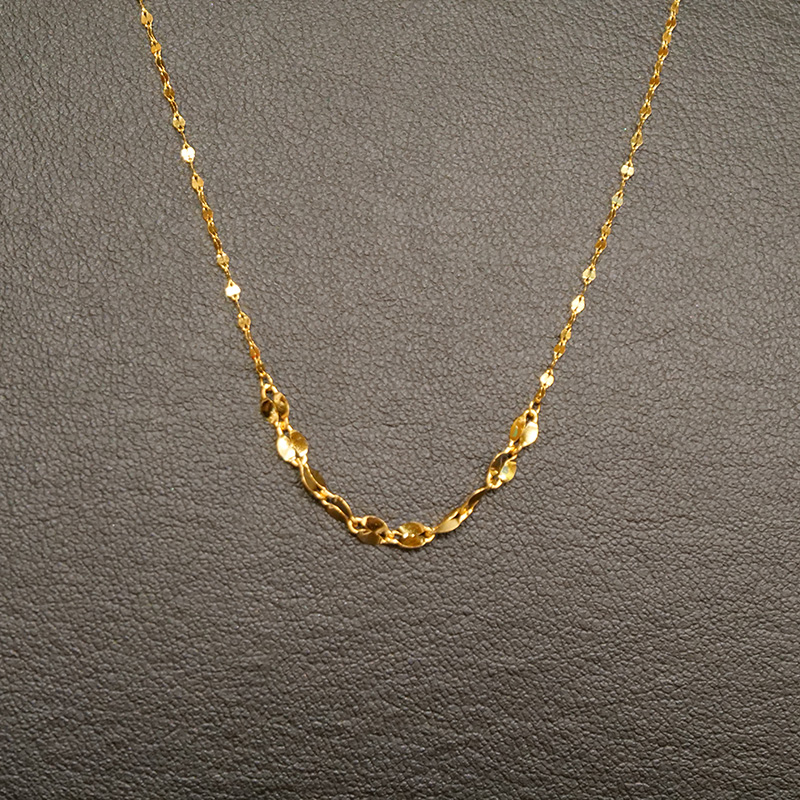 約1.2gの純金に加工を施したネックレスは、キラキラ煌めく花びらの形を施したペタルチェーンをセンターに、ボリュームを出したグラデーションのデザイン。